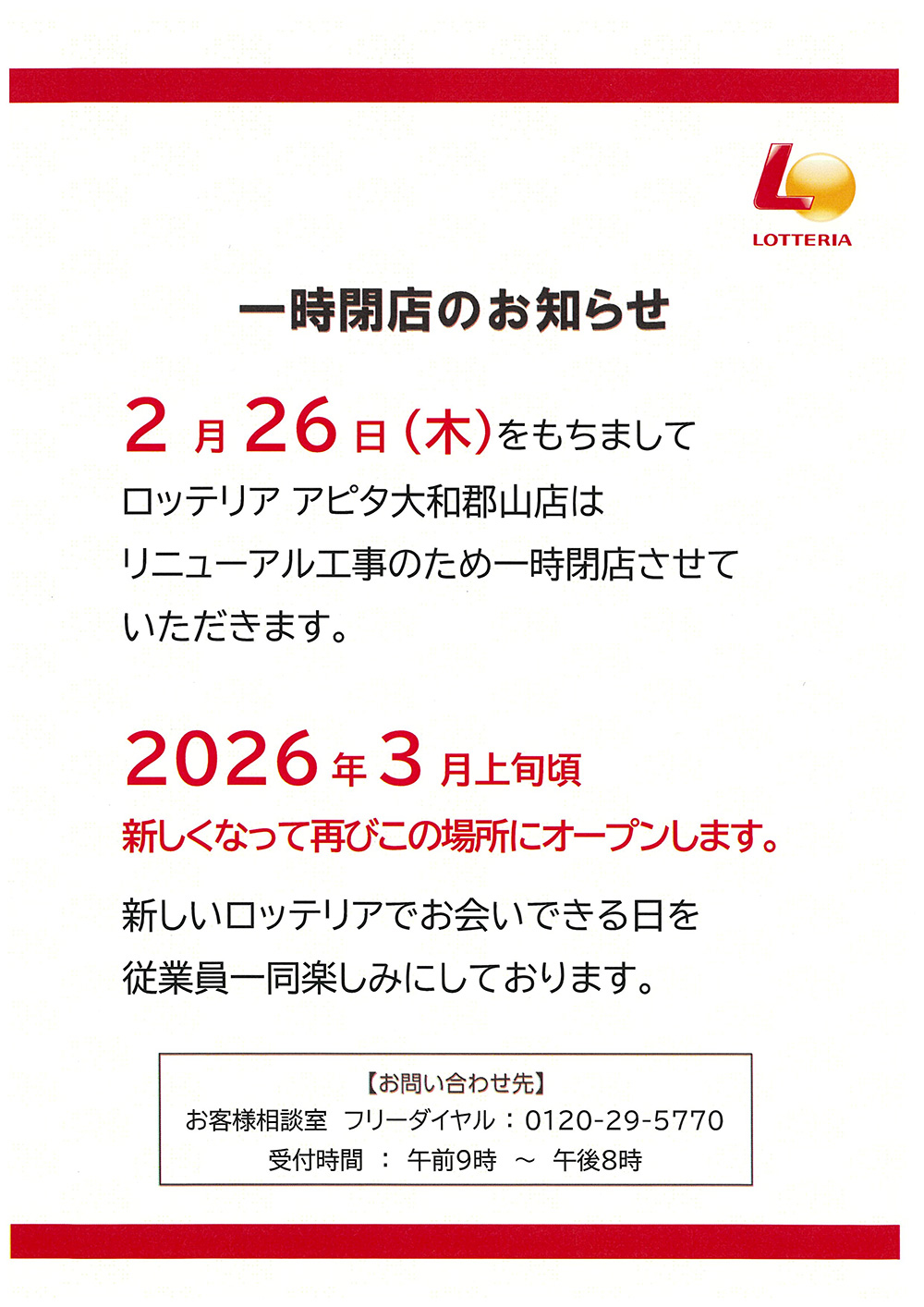 ショップニュース ロッテリアアピタ大和郡山店 一時閉店のお知らせ 一時閉店のお知らせ 2月26日(木)をもちましてロッテリアアピタ大和郡山店はリニューアル工事のため一時閉店させていただきます。 2026年3月上旬頃新しくなって再びこの場所にオープンします。新しいロッテリアでお会いできる [続きを読む] ショップニュース ロッテリア 春の味覚を華やかに楽しむ「ひなちらし」(海転寿司丸忠) 桃の節句にぴったりの「ひなちらし」が登場! 色とりどりの新鮮な具材を贅沢に盛り付けた、目にも美しい一品です。 家族で囲む食卓を華やかに彩り、ひな祭りのお祝いをお楽しみください。 ショップニュース 海転寿司丸忠 新規会員様募集中(クリーニングルビー) 新規会員様募集中! ご入会当日 クリーニング35%OFF ハンガーワイシャツ 1枚110円(税込) ショップニュース クリーニングルビー 春の入会キャンペーン 入会金無料 他特典あり(セイハ英語学院) オリコン顧客満足度3年連続No1のセイハ英語学院で英語デビューしませんか?初めての英会話は私たちにおまかせください ショップニュース セイハ英語学院 保険相談キャンペーン・生活応援キャンペーン ダブル開催!!(保険テラス) 保険相談キャンペーン・生活応援キャンペーン ダブル開催!! ダブルでプレゼントがあるこの機会にぜひお気軽にお越しください。 ショップニュース 保険テラス 補聴器 無料レンタル キャンペーン(メガネ・補聴器のイシガミ) 補聴器 無料レンタル キャンペーン ご自身の聞こえに合わせて調整された補聴器を ご自宅で、2週間お試し頂ける無料キャンペーンを実施中です。 お耳の聞こえで、ご不便を感じる方 補聴器を試してみたい方がおられましたら お気軽 [続きを読む] ショップニュース メガネ・補聴器のイシガミ イベント 求人情報 ショップガイド フロアガイド おトクな情報