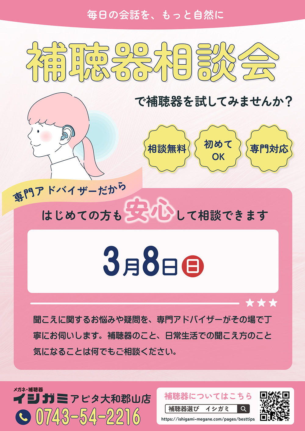 ショップニュース 3/8 補聴器相談会開催(メガネ・補聴器のイシガミ) 3月8日(日)に補聴器の無料相談会を開催 3月8日(日)に補聴器の無料相談会を開催いたします。 ご自身もしくは、ご家族の方のお耳の聞こえでご不便を感じる方がおられましたら 是非、この機会にお気軽にご相談下さい。 当日は最 [続きを読む] ショップニュース メガネ・補聴器のイシガミ ロッテリアアピタ大和郡山店 一時閉店のお知らせ 一時閉店のお知らせ 2月26日(木)をもちましてロッテリアアピタ大和郡山店はリニューアル工事のため一時閉店させていただきます。 2026年3月上旬頃新しくなって再びこの場所にオープンします。新しいロッテリアでお会いできる [続きを読む] ショップニュース ロッテリア 春の味覚を華やかに楽しむ「ひなちらし」(海転寿司丸忠) 桃の節句にぴったりの「ひなちらし」が登場! 色とりどりの新鮮な具材を贅沢に盛り付けた、目にも美しい一品です。 家族で囲む食卓を華やかに彩り、ひな祭りのお祝いをお楽しみください。 ショップニュース 海転寿司丸忠 新規会員様募集中(クリーニングルビー) 新規会員様募集中! ご入会当日 クリーニング35%OFF ハンガーワイシャツ 1枚110円(税込) ショップニュース クリーニングルビー 春の入会キャンペーン 入会金無料 他特典あり(セイハ英語学院) オリコン顧客満足度3年連続No1のセイハ英語学院で英語デビューしませんか?初めての英会話は私たちにおまかせください ショップニュース セイハ英語学院 保険相談キャンペーン・生活応援キャンペーン ダブル開催!!(保険テラス) 保険相談キャンペーン・生活応援キャンペーン ダブル開催!! ダブルでプレゼントがあるこの機会にぜひお気軽にお越しください。 ショップニュース 保険テラス 補聴器 無料レンタル キャンペーン(メガネ・補聴器のイシガミ) 補聴器 無料レンタル キャンペーン ご自身の聞こえに合わせて調整された補聴器を ご自宅で、2週間お試し頂ける無料キャンペーンを実施中です。 お耳の聞こえで、ご不便を感じる方 補聴器を試してみたい方がおられましたら お気軽 [続きを読む] ショップニュース メガネ・補聴器のイシガミ イベント 求人情報 ショップガイド フロアガイド おトクな情報