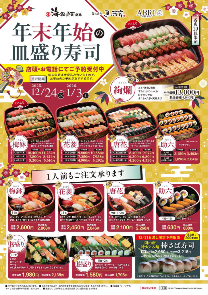 魚が旨い海転寿司丸忠の寿司皿ご予約承り中!(海転寿司丸忠) 公開済み: 2025年10月11日更新: 2025年10月10日作成者: adminカテゴリー: ショップニュース, 海転寿司丸忠 魚が旨い海転寿司丸忠の寿司皿ご予約承り中! 聖なる夜も新しい年の始まりも。 クリスマスから年末年始に寿司皿いかがでしょうか? 只今、先着でご予約承り中です。ご予約をお待ちしております。 電話&ご来店お待ちしております。