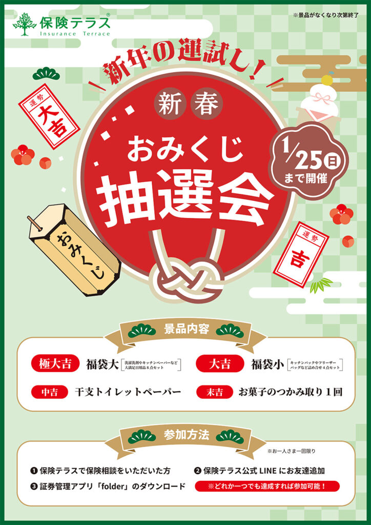 1/4〜1/25 新春おみくじ抽選会(保険テラス) 公開済み: 2026年1月4日更新: 2025年12月28日作成者: adminカテゴリー: ショップニュース, 保険テラス 新春おみくじ抽選会 1月25日(日)まで開催 参加方法 保険テラスで保険相談いただいたかた 保険テラス公式LINEにお友達追加 証券診断アプリ『folder』のダウンロード どれか一つでも達成すれば参加可能!お一人様一回限り ※景品が無くなり次第終了します。 関連記事 保険相談キャンペーン・生活応援キャンペーン ダブル開催!!(保険テラス) 保険相談キャンペーン・生活応援キャンペーン ダブル開催!! ダブルでプレゼントがあるこの機会にぜひお気軽にお越しください。 公開済み: 2026年1月4日更新: 2025年12月28日作成者: adminカテゴリー: ショップニュース, 保険テラス