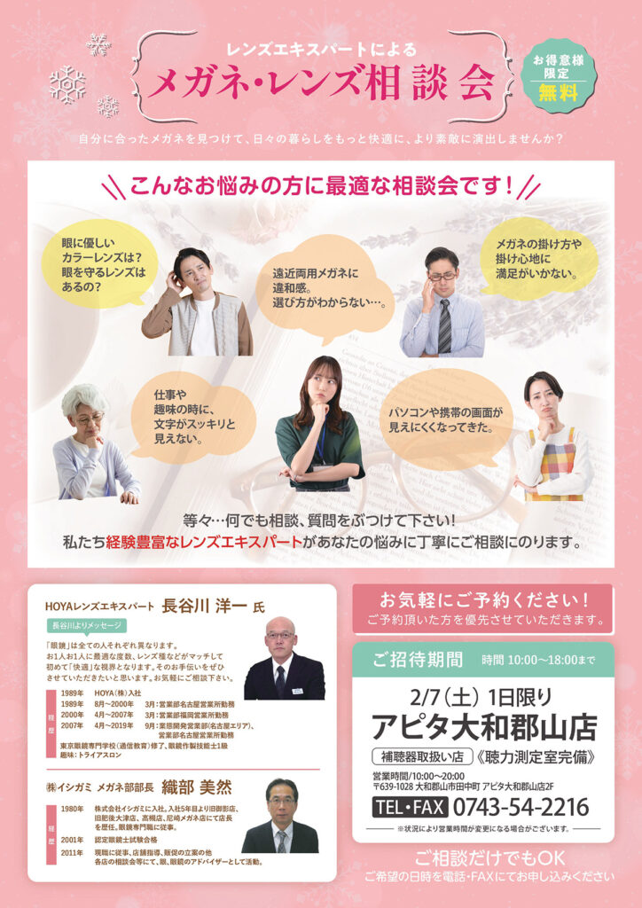 2/7(土) メガネ・レンズ相談会開催(メガネ・補聴器のイシガミ) 公開済み: 2026年1月18日更新: 2026年1月21日作成者: adminカテゴリー: ショップニュース, メガネ・補聴器のイシガミ 2月7日(土) メガネ・レンズ相談会 開催 現在、使用されているメガネの見え方にお悩みはないでしょうか? レンズメーカー HOYAよりレンズエキスパートが来店し、メガネにおけるお悩みの解決と、見える事の喜びを目指した、ワンランク上の視生活のご提案もさせていただきますので、お気軽にご相談下さい。 ご予約の方が優先になります。 お電話でのご予約を承っております。 関連記事 半期に一度の大セール(メガネ・補聴器のイシガミ) 1/1~2/22の期間 半期に一度の大セール ウインターバーゲン開催しております。 フレーム・レンズ,サングラスが表示価格より15%オフ さらにメガネ2本同時購入で、2本目が表示価格より30%オフと お買い得になってお [続きを読む] 公開済み: 2026年1月3日更新: 2026年1月3日作成者: adminカテゴリー: ショップニュース, メガネ・補聴器のイシガミ 補聴器 無料レンタル キャンペーン(メガネ・補聴器のイシガミ) 補聴器 無料レンタル キャンペーン ご自身の聞こえに合わせて調整された補聴器を ご自宅で、2週間お試し頂ける無料キャンペーンを実施中です。 お耳の聞こえで、ご不便を感じる方 補聴器を試してみたい方がおられましたら お気軽 [続きを読む] 公開済み: 2025年12月8日更新: 2025年11月25日作成者: adminカテゴリー: ショップニュース, メガネ・補聴器のイシガミ